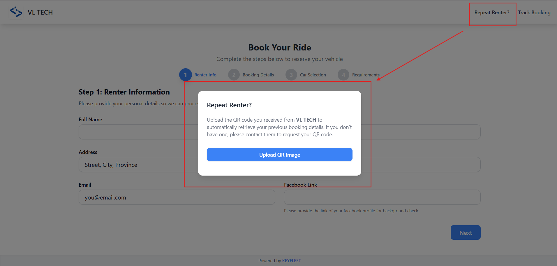 Click the “Repeat Renter?” link at the top of the form, then upload the QR code received from your operator during your previous booking.